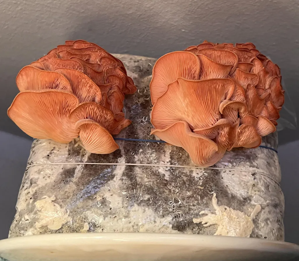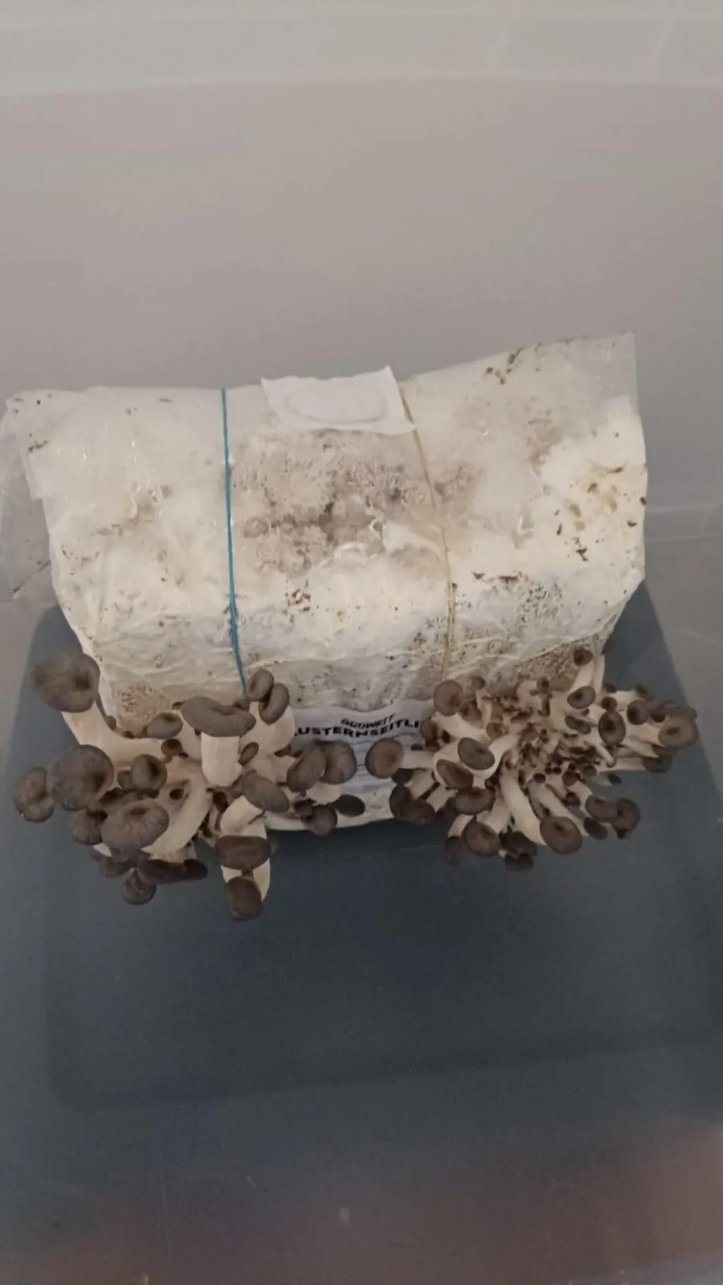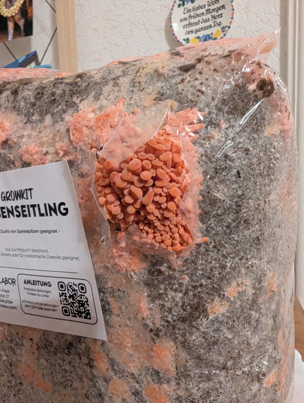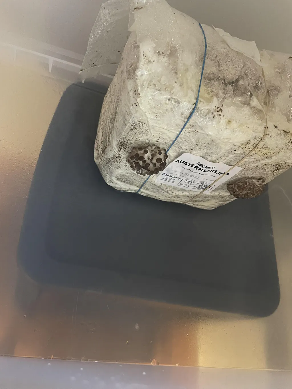 Täglich kurz besprühen, damit die Feuchtigkeit stimmt. Nach 7–14 Tagen siehst du die ersten Fruchtkörper – und wenn die Pilze groß genug sind, ab in die Pfanne.
